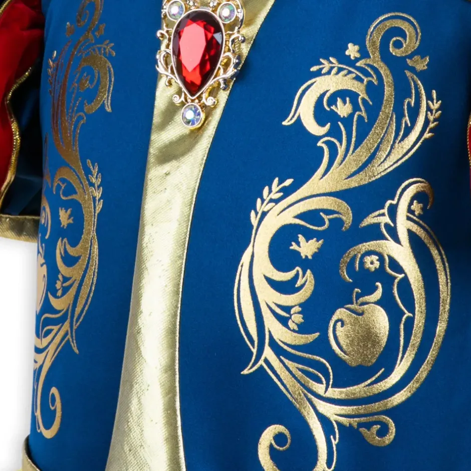 - Manches bouffantes avec panneaux rouges en velours et bordure dorée