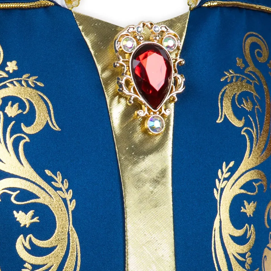 - Manches bouffantes avec panneaux rouges en velours et bordure dorée